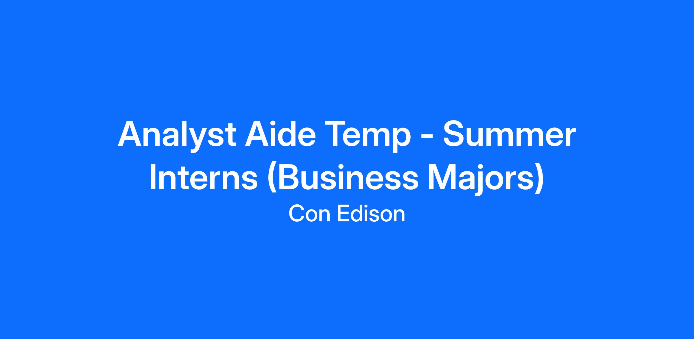 - The Con Edison Summer Internship program is a 10 - 12 week paid opportunity to gain hands-on experience with meaningful work, while developing your skills, and building your network. The internship has an estimated start date of May/June 2026 and an estimated end date of August/September 2026. Internships are offered across our service territories (Brooklyn, Bronx, Manhattan, Staten Island, Queens, and Westchester) and placements will be based on best fit for the business needs. As an Analyst Aide, you will be responsible for assisting Finance, Auditing, Treasury, Cost Management, and Strategic Planning, Corporate Affairs, or other business operations teams that support safe, reliable, and cost-effective energy delivery to our customers across our electric, gas, and steam commodities. Your assignment may include providing administrative support, project management support, data collection and analysis, forecasting support, strategy development support, and other operational support depending upon department needs.