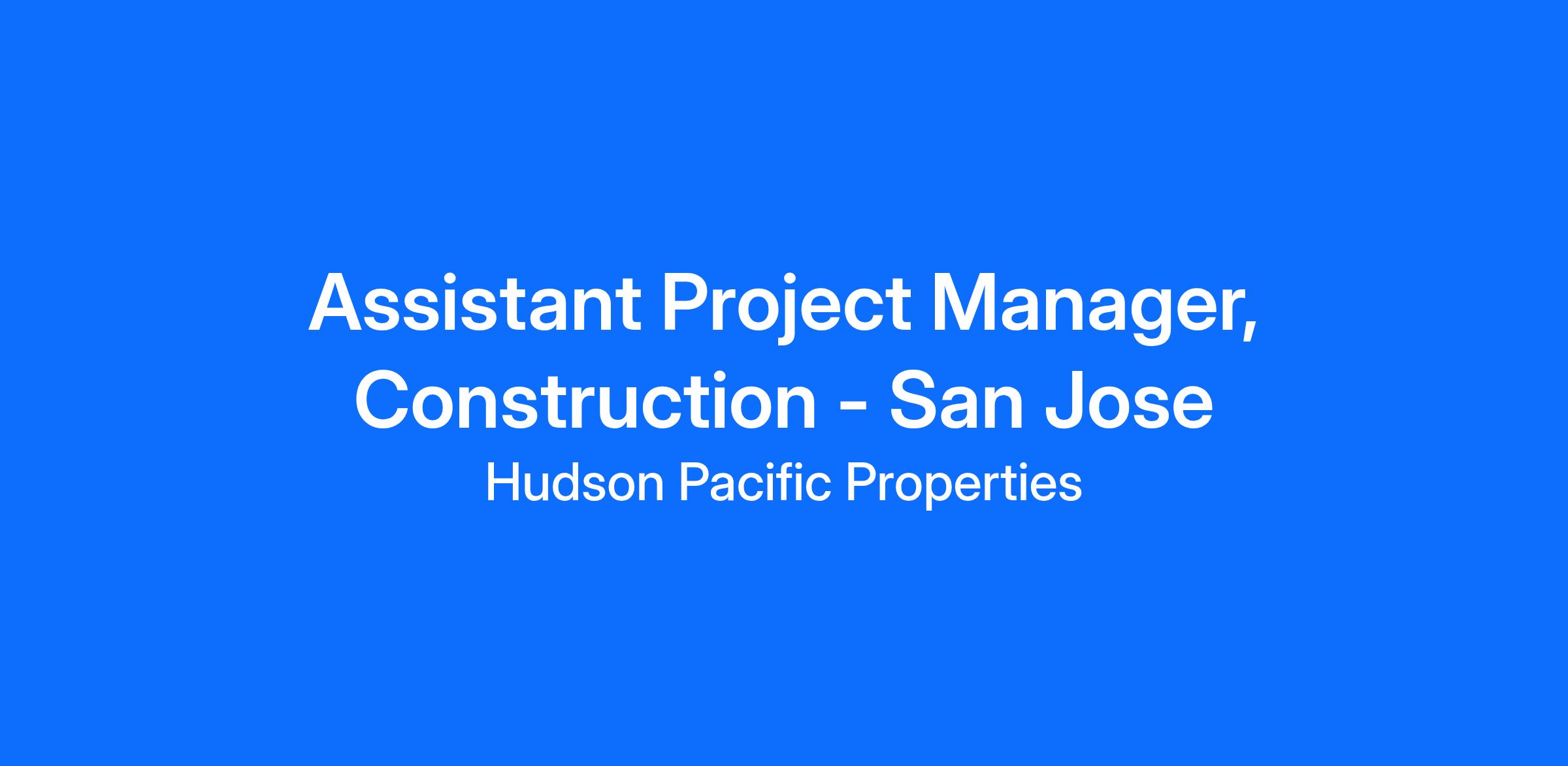 At Hudson Pacific Properties, we provide best-in-class office space to the biggest names in tech and media (Netflix & Amazon), and we're seeking an Assistant Project Manager supporting construction. This role is based in our San Jose regional office and will support projects in San Jose, Palo Alto, and Redwood Shores, with occasional travel between these locations.