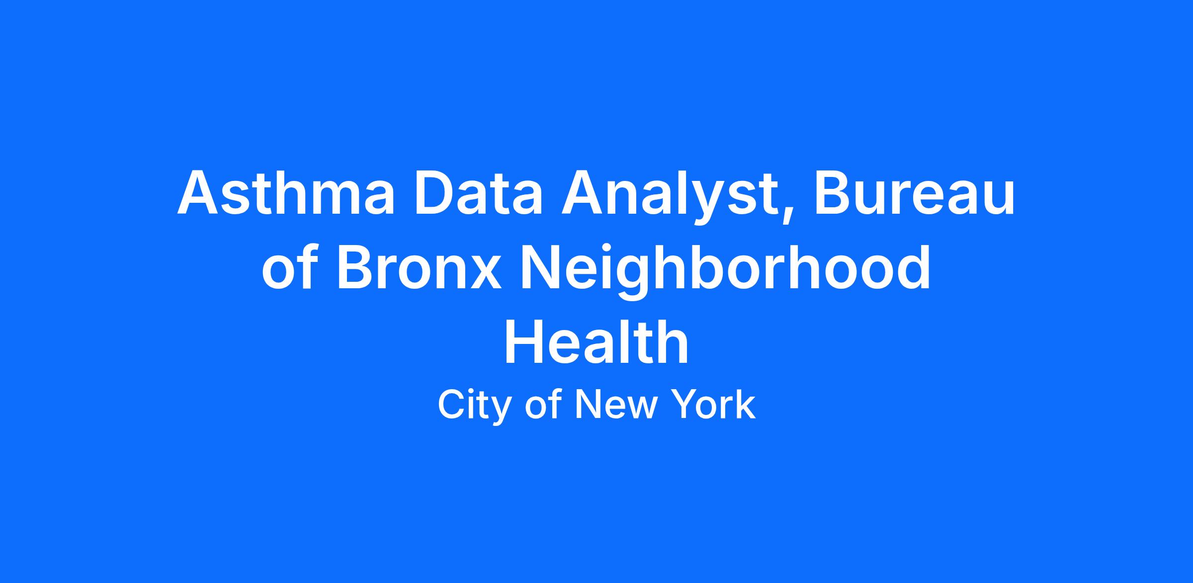 The Bureau of Bronx Neighborhood Health seeks to hire a Asthma Program Analyst who will be responsible for the day-to-day management of data collection and analysis.
