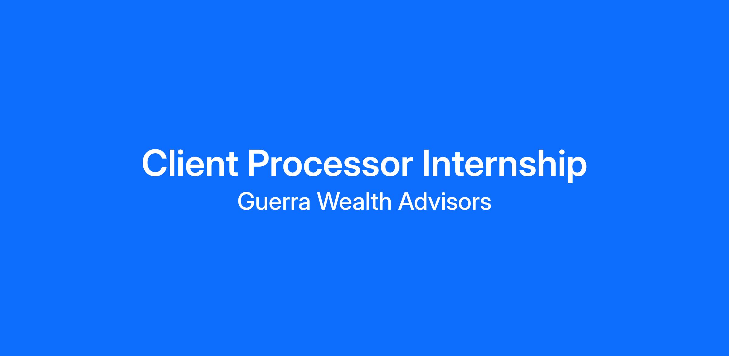 The Onboarding Processor Intern supports the New Business team by assisting with critical back-office processes that directly influence our clients' first experience with Guerra Wealth Advisors. You will help track financial applications, maintain CRM systems, and support the onboarding of new clients while gaining a deep understanding of financial services operations.