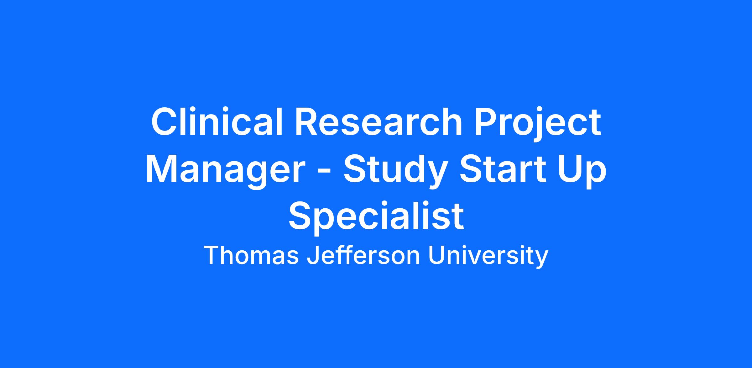 Jefferson Clinical Research Institute (JCRI) seeks a highly motivated and detail-oriented Clinical Research Study Start-Up Specialist to join our dynamic team. The ideal candidate will be responsible for managing and overseeing the start-up phase of clinical trials, ensuring that all required regulatory, site, and logistical components are completed in a timely and efficient manner. This role requires strong organizational skills, a deep understanding of clinical trial processes, and the ability to collaborate with cross-functional teams to ensure smooth and successful study initiation. Works with minimal supervision. This role will be the main contact for all trial start-up activities, across multiple departments, including but not limited to preparation for monitoring visits, and regulatory and/or IRB document preparation. Ensuring all study procedures are conducted according to the protocol and applicable regulations. Trains research staff, supervises staff and oversees clinical trials from start-up to closeout. Develops and/or contributes to standard operating procedures and processes. Attends and engages in leadership meetings, represents TJU internally and externally, oversees research operation in a division or department and provides expert consulting at an institutional level.Job Description