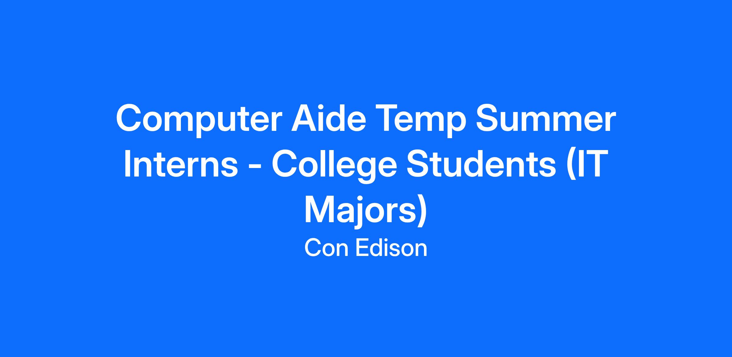 - The Con Edison Summer Internship program is a 10 - 12-week paid opportunity to gain hands-on experience with meaningful work, while developing your skills, and building your network. The internship has an estimated start date of May/June 2026 and an estimated end date of August/September 2026. Internships are offered across our service territories (Brooklyn, Bronx, Manhattan, Staten Island, Queens, and Westchester) and placements will be based on best fit for the business needs. As a Computer Aide, you will be responsible for assisting members of our Information Security, Business Applications, Analytics Center of Excellence, Network Systems, Infrastructure Planning, Advanced Metering Infrastructure (AMI), or related IT business operations teams that support safe, reliable, and cost-effective energy delivery to our customers across our electric, gas, and steam commodities. Your assignment may include providing administrative support, project management support, data collection and analysis, network support, application development support, and other operational IT support depending upon department needs.