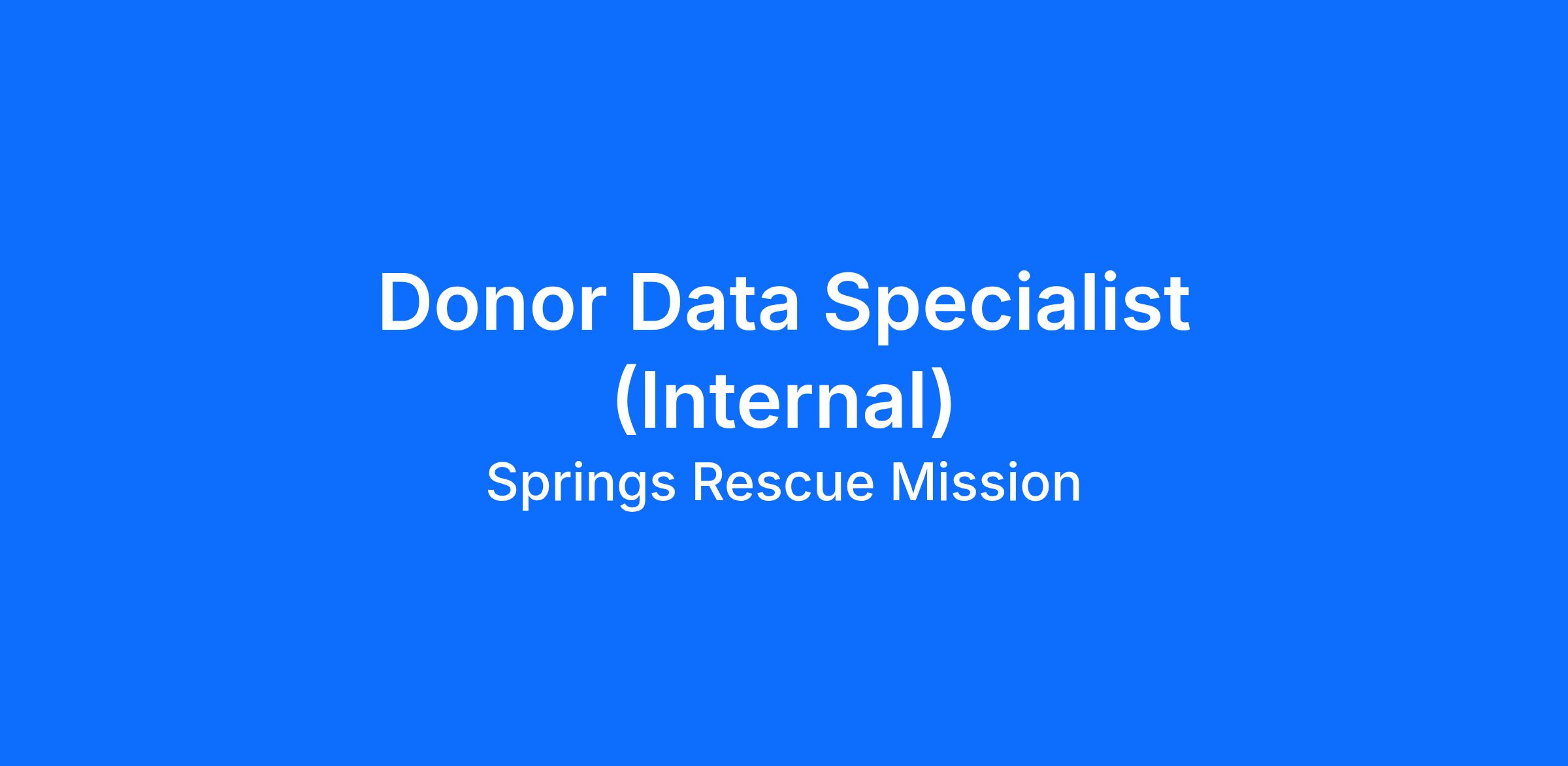 Springs Rescue Mission considers every position one of ministry and a vital and valued part of our team. Therefore, it is essential that all employees of SRM have a personal relationship with Jesus Christ and subscribe to our Statement of Faith and Core Values. The Donor Data Specialist reports to and supports the Advancement Department by developing and managing internal processes, software, data and business intelligence to maximize Springs Rescue Mission’s stewardship of donor relationships and resources. This position works to create systems that measure metrics tied to fundraising success and helps teams determine strategic audiences for messaging and relationship-building. In addition, this role supports Advancement by overseeing administrative support for CRM software to help teams stay focused on external relationships.