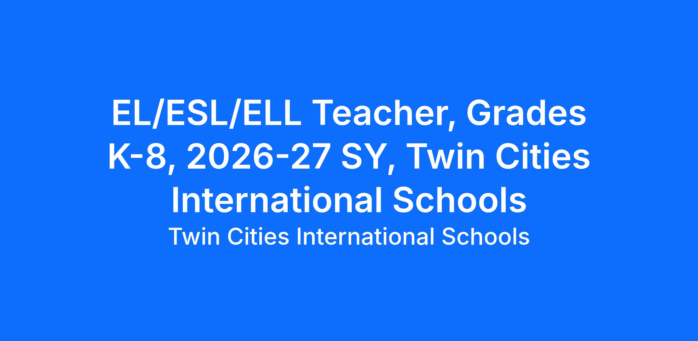 Twin Cities International Schools (TCIS) is taking applications for an EL/ESL/ELL (English Language) Teacher to work with Elementary and Middle School students (Grades K-8) for the 2026-27school year. Applicants must hold a valid and current Minnesota EL teaching license prior to classroom teaching. We are a public charter school located in the North Loop of Minneapolis with a student enrollment of approximately 1,000 (K-8) students and a large LEP population. The EL teacher will be responsible for teaching various groups of students, creating lesson plans, working with collaborative teams, engaging in clear communication with both staff and students and contributing positively to the learning and development of students. Experience with standards-based instruction, English Language Learners and common assessments a plus. A dual licensed, Elementary School Education and EL Licensure is preferred.
