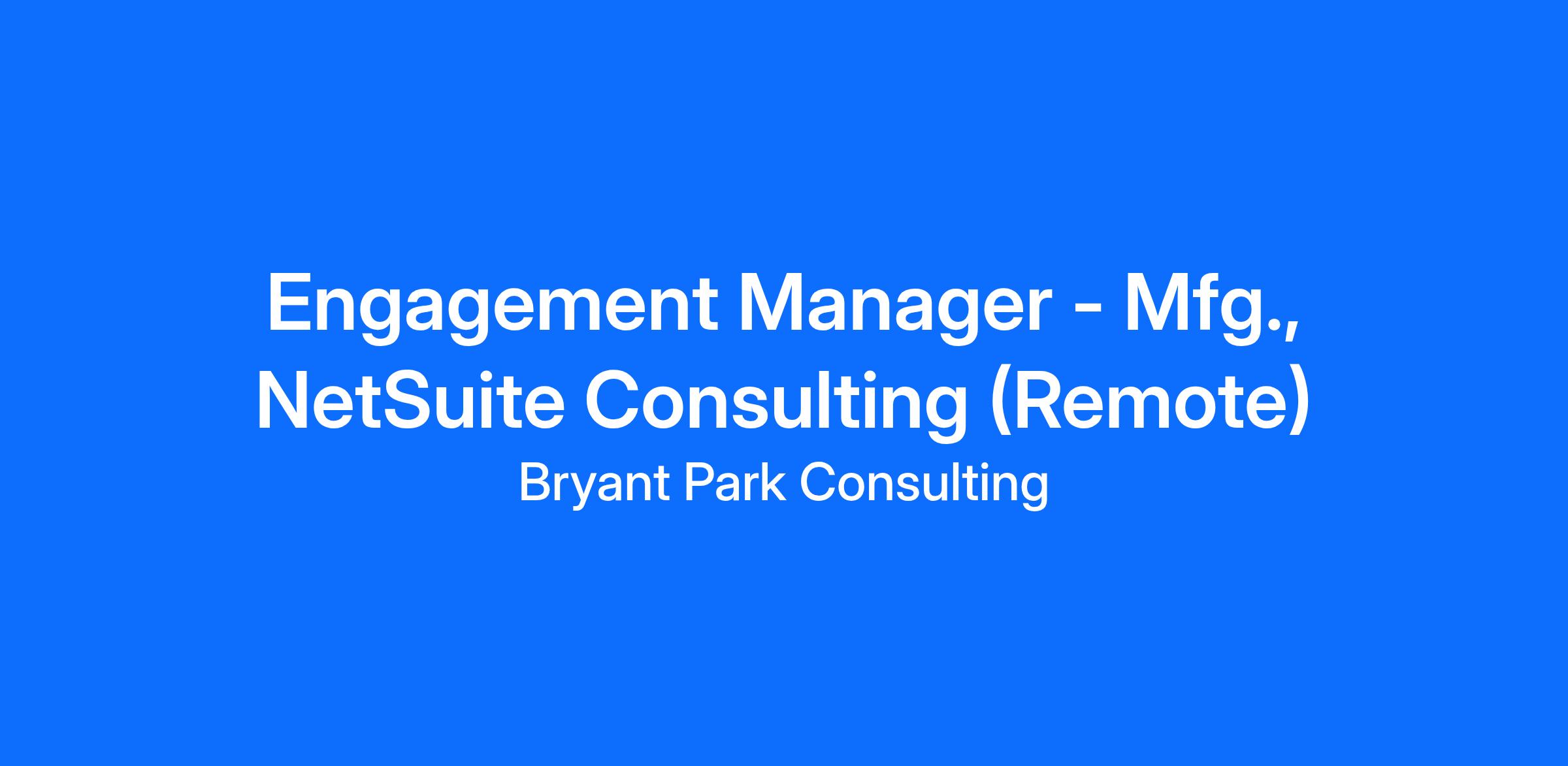 As an Engagement Manager (Manufacturing) with Bryant Park Consulting you will report to our Practice Manager and be responsible for managing and developing a team of up to 10 consultants, and analysts to successfully deliver end-to-end implementations of NetSuite for a portfolio of Clients. This is a role that carries a utilization target and Engagement Managers are hands-on in Client engagements serving as Sponsor and even as Architect or Project Manager on our more strategic and high visibility engagements. Engagement Managers will collaborate with other EMs across verticals and disciplines to grow the NetSuite practice and improve process. Client stakeholders and your team at BPC will look up to you for organizational and engagement leadership and business process and systems architecture advisory based on your extensive NetSuite and business transformation experience.