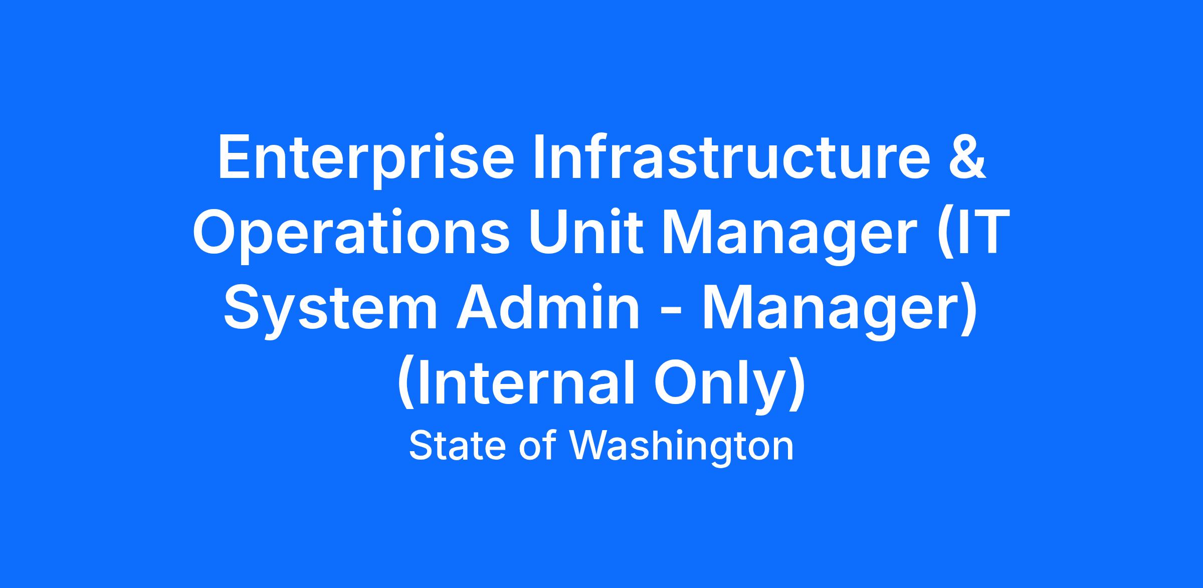 The Department of Ecology is hiring an Enterprise Infrastructure & Operations Unit Manager (IT System Administration - Manager) (Internal Only) within the Information Technology Services Office (ITSO).
