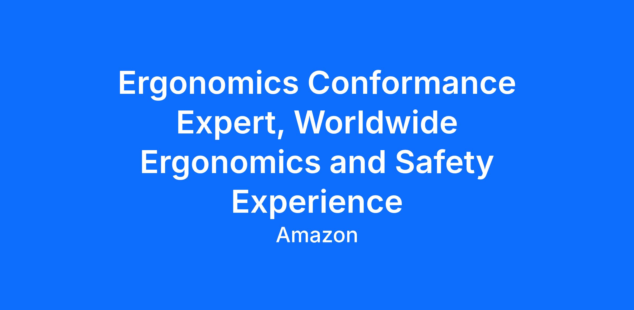 At Amazon, we strive to be Earth's best employer. The Workplace Health & Safety (WHS) Worldwide Ergonomics and Safety Experience (WESE) team is seeking a detailed-oriented, experienced Ergonomics Expert to join the Ergonomics Policy Implementation team vertical and coordinate regulatory ergonomic responses with the governance and external affairs team.