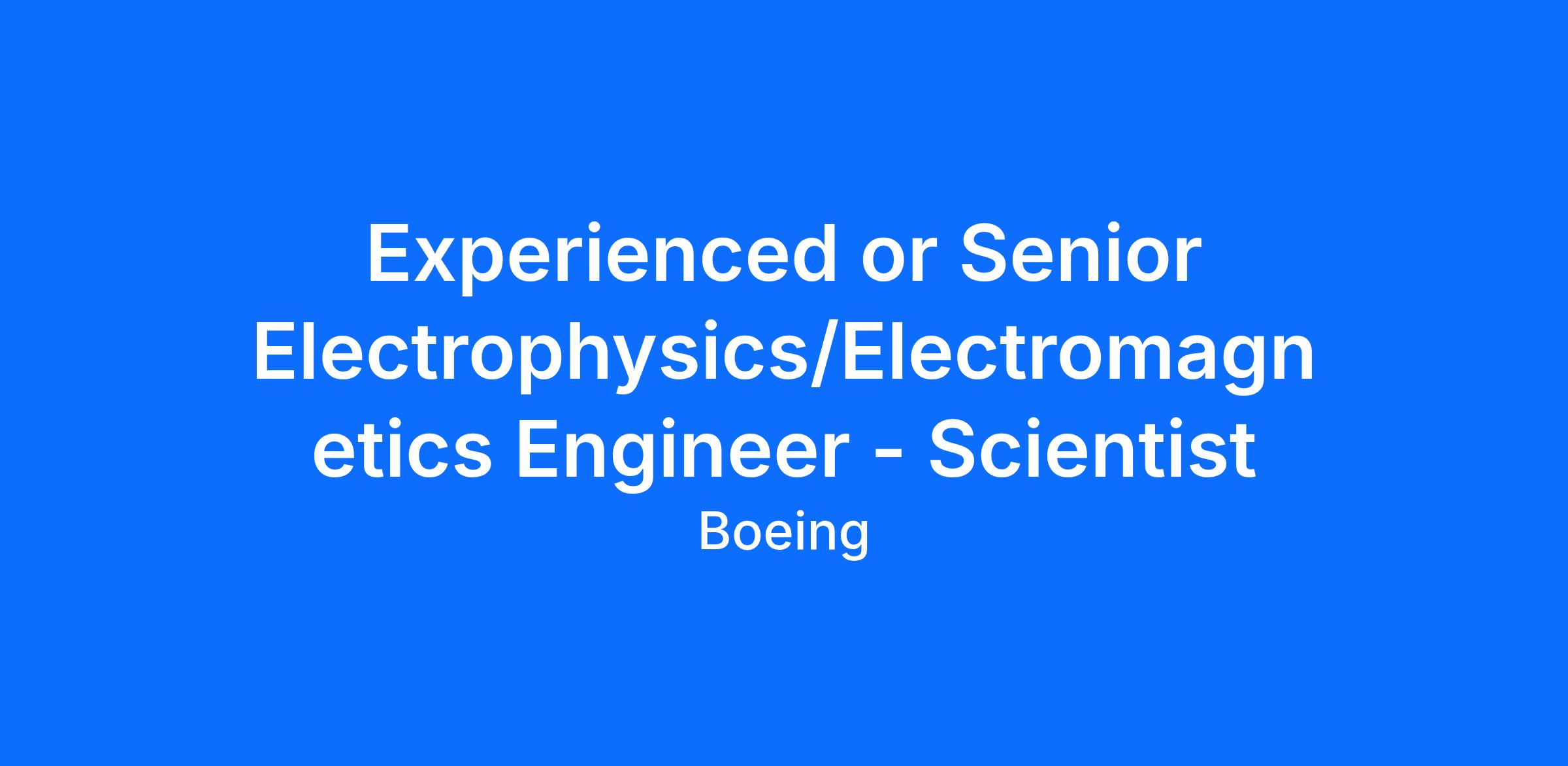 The Boeing CompanyThe Boeing Company is currently seeking an Experienced or Senior Electro-Electromagnetics Engineer - Scientist to join the E3 Design Integration Team located in Berkeley, Hazelwood or St. Charles, MO. This position will focus on supporting the Boeing Defense, Space & Security (BDS) business organization.