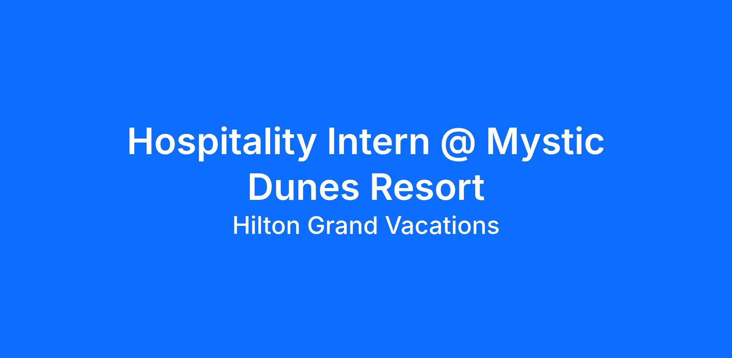 The HGV Intern at Mystic Dunes Resort & Golf Club, will participate in a ten (10) week, (June 1st – August 7th), immersive experience that will provide insight and competence into a designated Business Unit at Hilton Grand Vacations. Interns will gain work experience through project involvement, job shadowing, cross-departmental interactions, hands-on training opportunities, etc. Over the course of the program, Interns will be required to participate in several development opportunities through scheduled trainings, sales gallery and contact center tours, community outreach and corporate events. The program will culminate in a group presentation to a Senior Leadership panel.