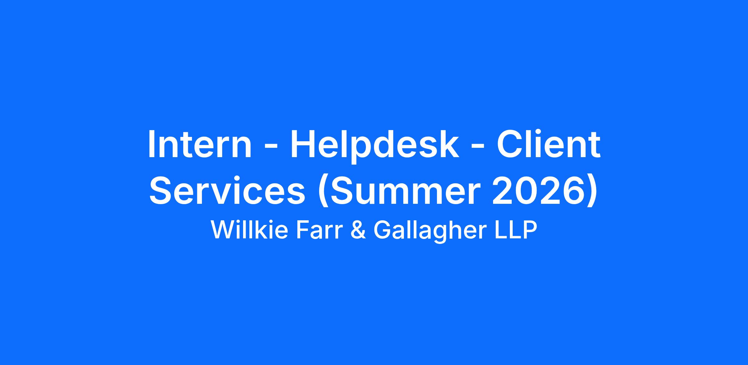 Willkie Farr & Gallagher LLP is looking for an Client Services Intern to join our 2026 Summer Internship program to support the Information Technology department. Willkie is an elite international law firm with approximately 1,300 lawyers across 16 offices in six countries.