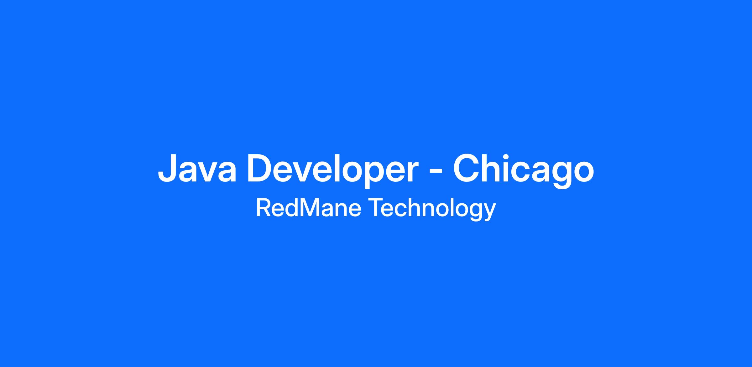 <\/html>"}}],"isMobile":false,"iframe":"true","jobType":"Full time","applyName":"Apply Now","zsoid":"698822486","FontFamily":"Verdana, Geneva, sans\-serif","jobOtherDetails":[{"fieldLabel":"City","uitype":1,"value":"Chicago"},{"fieldLabel":"State\/Province","uitype":1,"value":"Illinois"},{"fieldLabel":"Industry","uitype":2,"value":"Technology"},{"fieldLabel":"Zip\/Postal Code","uitype":1,"value":"60656"}],"headerName":"Java Developer \- Chicago","widgetId":"565243000000072311","isJobBoard":"false","userId":"565243000000274007","attachArr":[],"customTemplate":"3","isCandidateLoginEnabled":false,"jobId":"565243000025043036","FontSize":"12","googleIndexUrl":"https:\/\/redmane.zohorecruit.com\/recruit\/ViewJob.na?digest=p2GysQ0JPfWTqB3oHQic4nBQ6rgvpNvFQEnQD0xgDVE\-&embedsource=Google","location":"Chicago","embedsource":"CareerSite","logoId":"i7x3a34589c17680546b28dfe5a43b43fa3fb"}