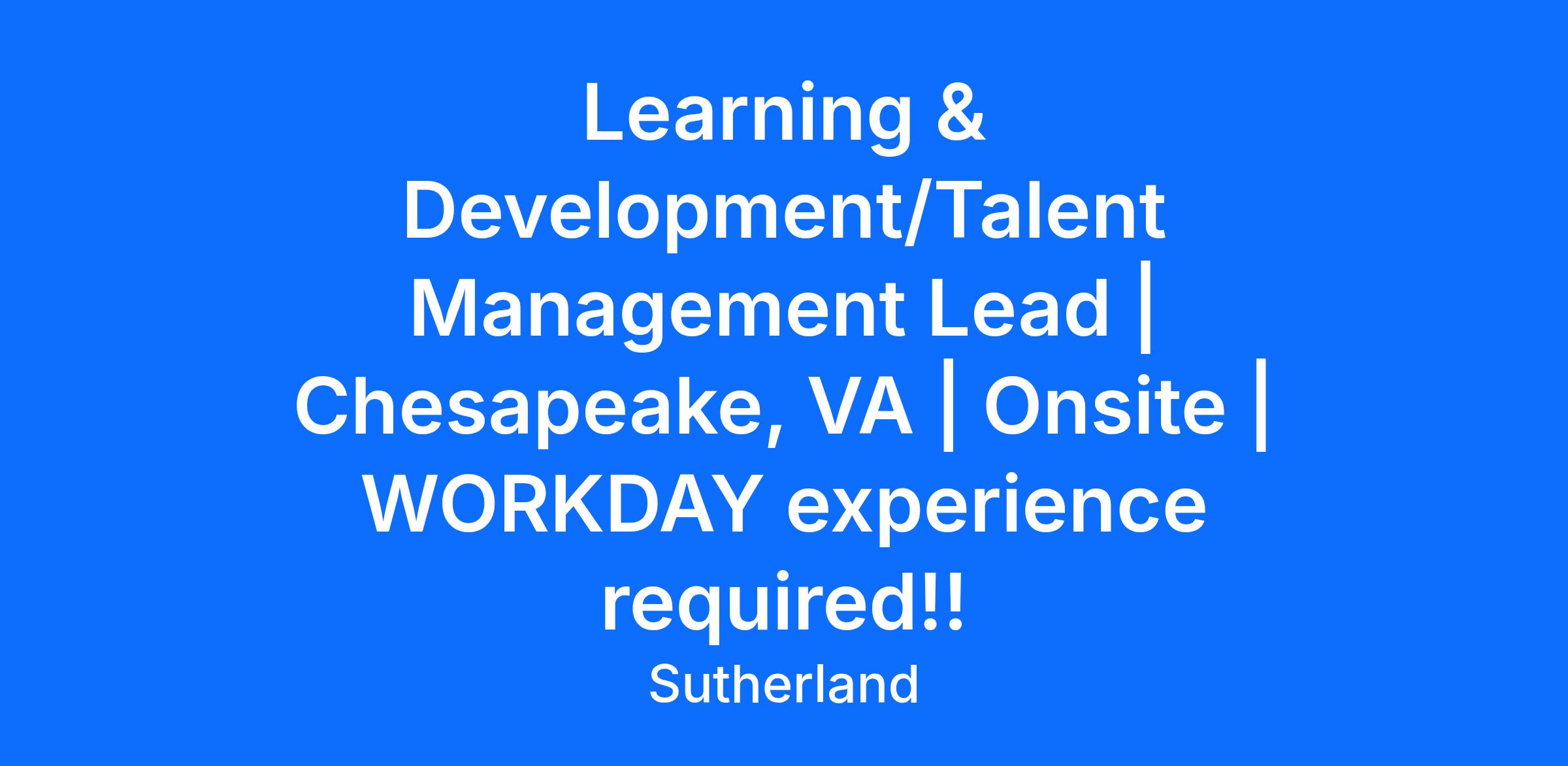 We are seeking an experienced Learning & Development /Talent Management Lead to be based on-site at our client location in Chesapeake, Virginia. This position will serve as the primary liaison between HR Shared Services, Talent & Culture COE, and US leadership teams. MUST have experience with the Workday platform.
