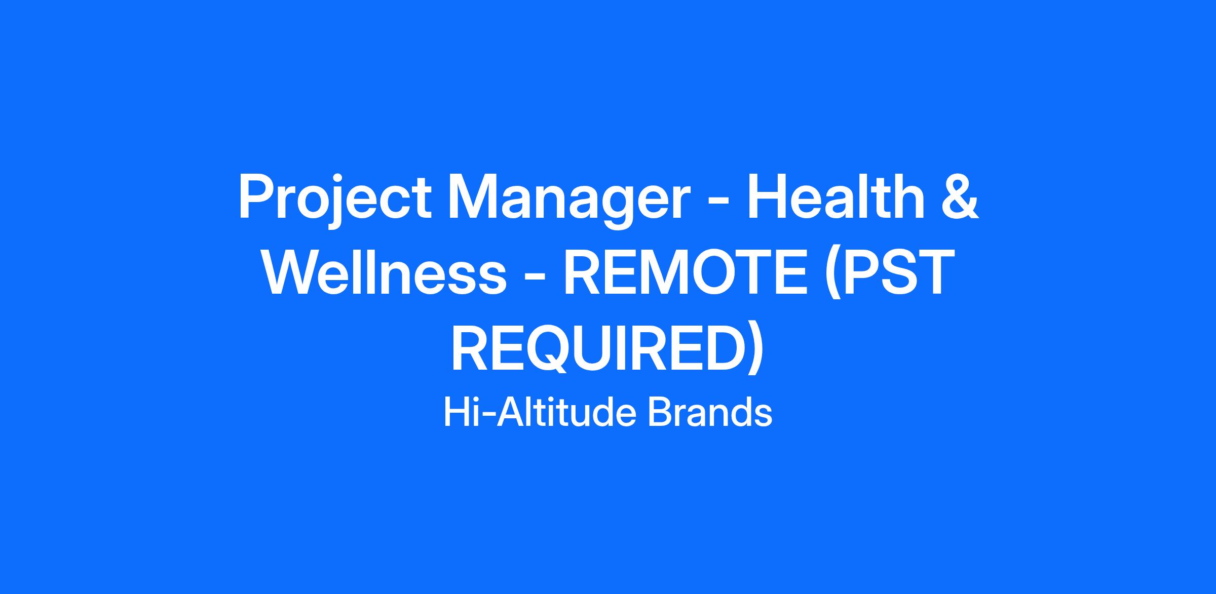 DescriptionHi-Altitude Brands is a direct-to-consumer, large-scale performance-based e-commerce company. We are seeking a full-time, remote Project Manager, who loves the details, gets excited about planning, and thinks about risks that may get in the way. You transition effortlessly between details and the big picture. This role requires equal parts planner, problem solver, analytical thinker, relationship facilitator, and cheerleader. You have a deep understanding and experience within the direct to consumer (DTC) supplement (health and wellness) industry, developing effective workflow systems and implementing the best project management methodologies. You thrive in an ever-changing environment and know how to adapt your approach when working with people from different disciplines (Brand Marketing, Analytics, Product Development, Executive/Leadership, etc.) This role reports directly to the Chief of Staff and will support all Omni-channel brand initiatives, working in close partnership with an existing Project Manager as part of a small, highly collaborative team, sharing ownership across initiatives while maintaining clear areas of responsibility.