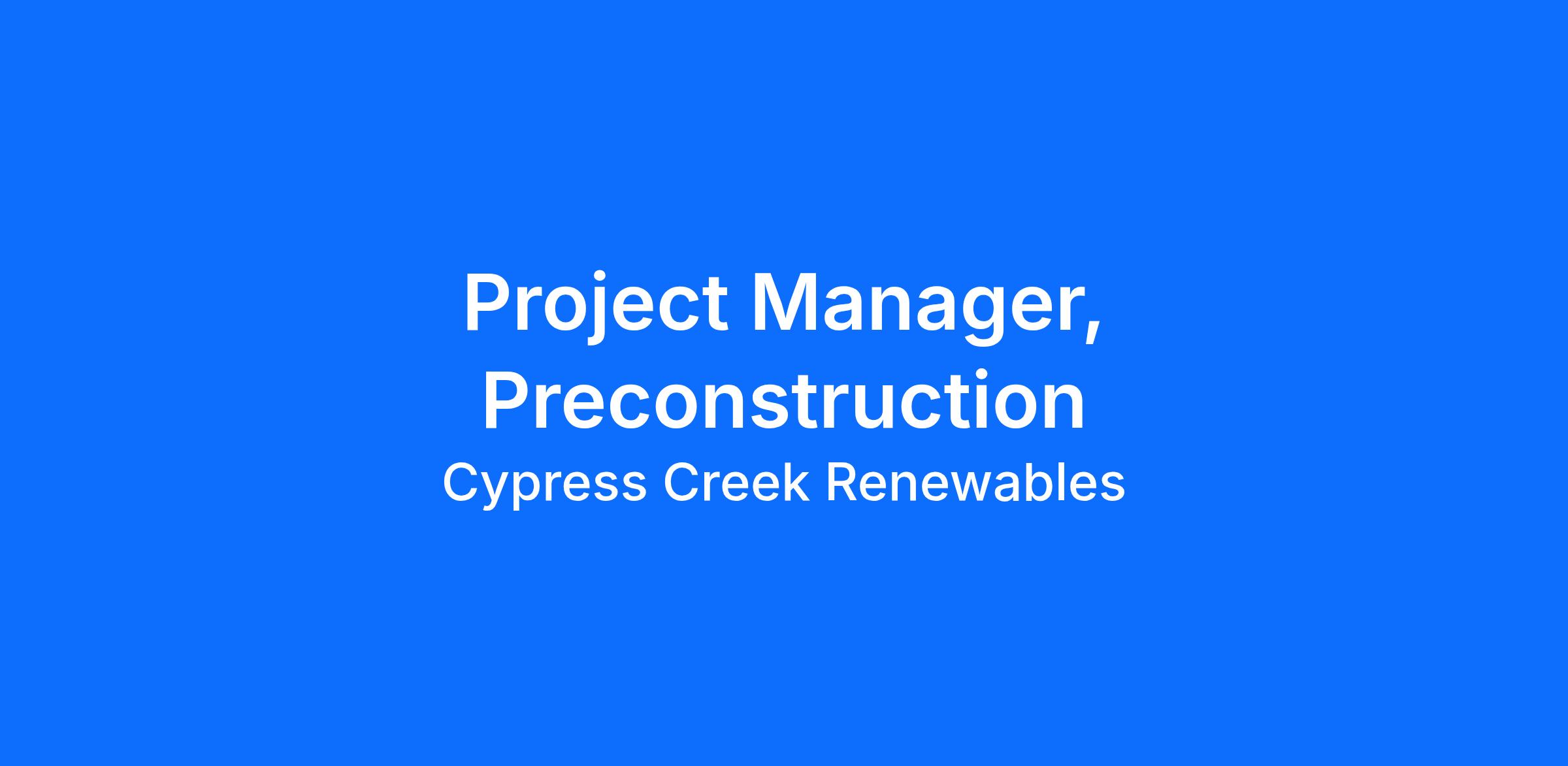 Cypress Creek, a renewable energy project developer and owner (the "Company") is seeking a Project Manager of Pre-Construction reporting to the Director of Pre-Construction.