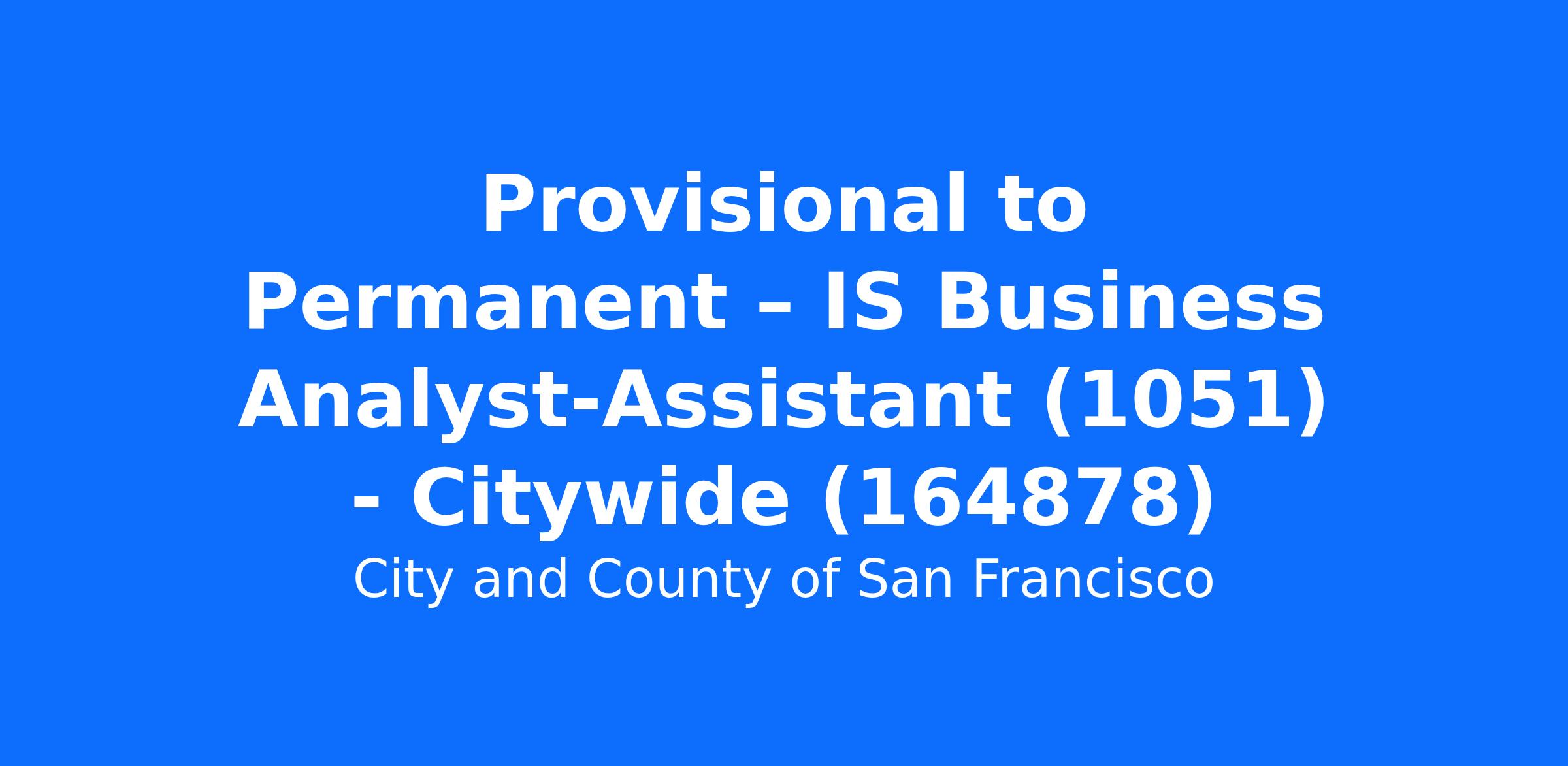 This is a Provisional to Permanent position in accordance with Class-Based Test (CBT) Civil Service Rules. This recruitment is restricted to current provisional employees of the City and County of San Francisco, San Francisco Unified School District, or San Francisco City College, working within the 1051 IS Business Analyst-Assistant classification and only those who meet this requirement will be placed on the eligible list for consideration of future permanent position.