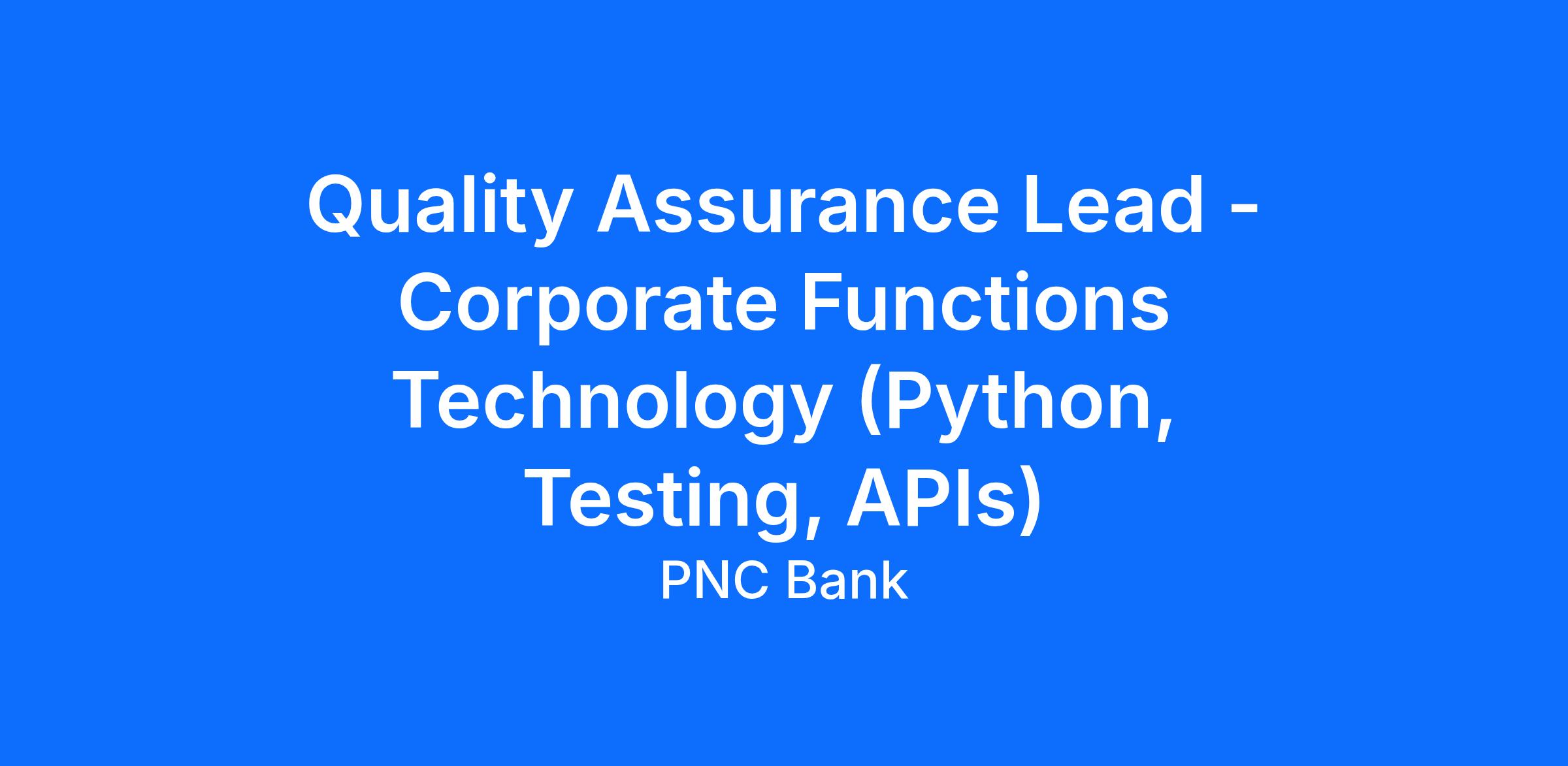 At PNC, our people are our greatest differentiator and competitive advantage in the markets we serve. We are all united in delivering the best experience for our customers. We work together each day to foster an inclusive workplace culture where all of our employees feel respected, valued and have an opportunity to contribute to the company’s success. As a Quality Assurance Lead within PNC's Corporate Functions Technology organization, you will be based in Pittsburgh, PA or Strongsville, OH.