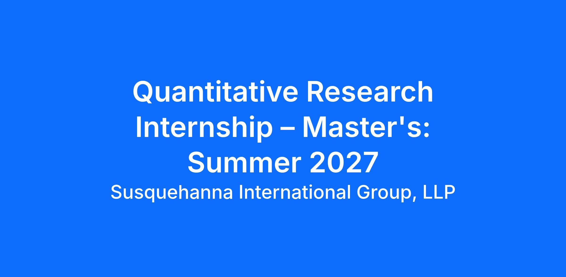 As a Quantitative Research Intern at Susquehanna, you will work on projects that model the work of our full-time employees. You will also go through a comprehensive education program and interact with mentors who are at the top of their field, allowing you to build foundational knowledge in quantitative finance. You will have the opportunity to build alphas on an actual trading strategy.