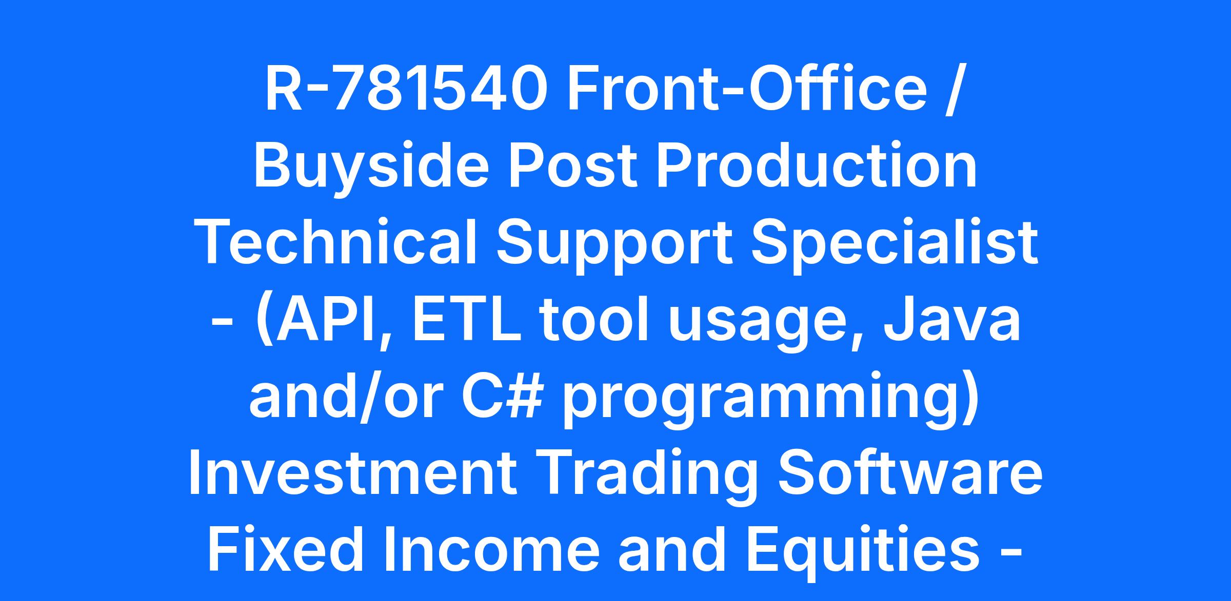 The Specialist will liaise with other Charles River Support team and Product resources to troubleshoot application issues and to determine the optimal technical solution. The ideal candidate will have at least 3 to 5 years of hands-on experience gained in the financial industry working for a consultancy or software vendor. This role is a highly technical role and spans XML messaging, Charles River web services API, ETL tool usage, Java and/or C# programming, and database administration tasks.
