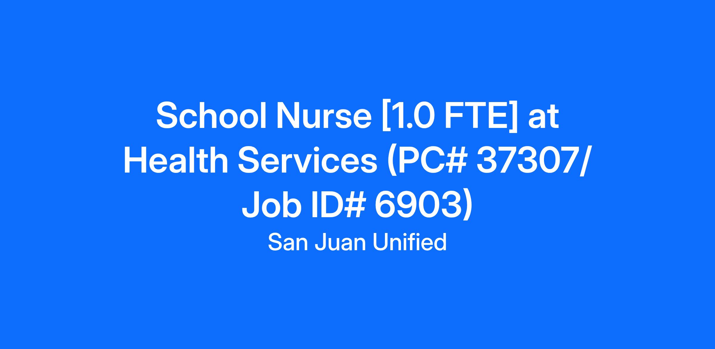 Location/Site: Health Services Number of Openings: 1 Position Type: Permanent Employment Type (FTE): Full Time 1.0 FTE Salary: $60,000 - $126,000 / annually For those holding a CA Credential, please select TK-12 Salary Schedule For those holding Waivers, Intern Permits, or Emergency Permits, please select EMG TK-12 Salary Schedule **Opportunities for stipends include $3,000/annually (Masters Degree), $2,000/annually for Hard to Staff (as of ../../.... [posting date]). For full list of potential stipends please click here Benefits Included Length of Work Year: School Nurse – Calendar 23 (10 Months/Year, 187 Days/Year, 5 Days/Week, Professional Work Day) School Nurse Job Description Posting Contact: Garrett Godfrey, Personnel Technician: garrett.godfrey@sanjuan.edu