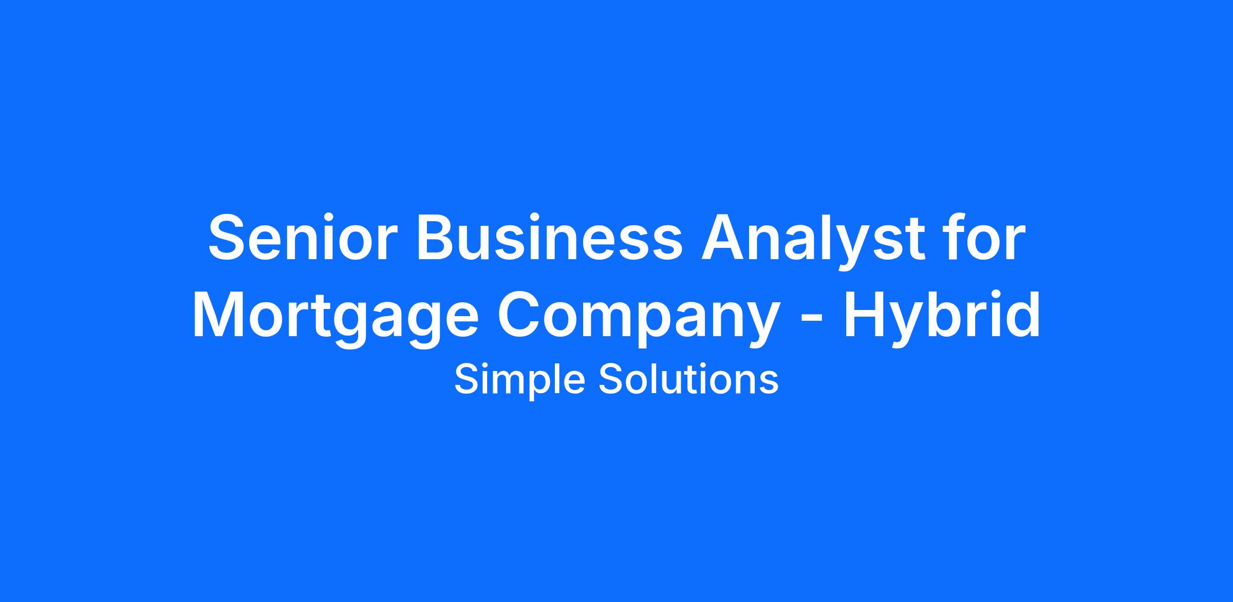 <\/html>"}}],"isMobile":false,"iframe":"true","jobType":"Contract","applyName":"Apply Now","zsoid":"662490260","FontFamily":"PuviRegular","jobOtherDetails":[{"fieldLabel":"Industry","uitype":2,"value":"Financial Services"},{"fieldLabel":"Job Opening ID","uitype":111,"value":"ZR_2850_JOB"},{"fieldLabel":"Work Experience","uitype":2,"value":"8\-10 Years"},{"fieldLabel":"Salary","uitype":1,"value":"65\-75"},{"fieldLabel":"City","uitype":1,"value":"Dallas"},{"fieldLabel":"State\/Province","uitype":1,"value":"Texas"},{"fieldLabel":"Zip\/Postal Code","uitype":1,"value":"75201"}],"headerName":"Senior Business Analyst for Mortgage Company \- Hybrid","widgetId":"441940000000072311","isJobBoard":"false","userId":"441940000000194003","attachArr":[],"customTemplate":"3","isCandidateLoginEnabled":true,"jobId":"441940000104935470","FontSize":"15","googleIndexUrl":"https:\/\/simplesolutions.zohorecruit.com\/recruit\/ViewJob.na?digest=y7aAKF2qOzvLOXeqB8tAB1vsQ@Rri1DnzSzA.o2YlM8\-&embedsource=Google","location":"Dallas","embedsource":"CareerSite","indeedCallBackUrl":"https:\/\/recruit.zoho.com\/recruit\/JBApplyAuth.do","logoId":"60ly0a8d0c6dd592942c4b0bb6d05adacee99"}
