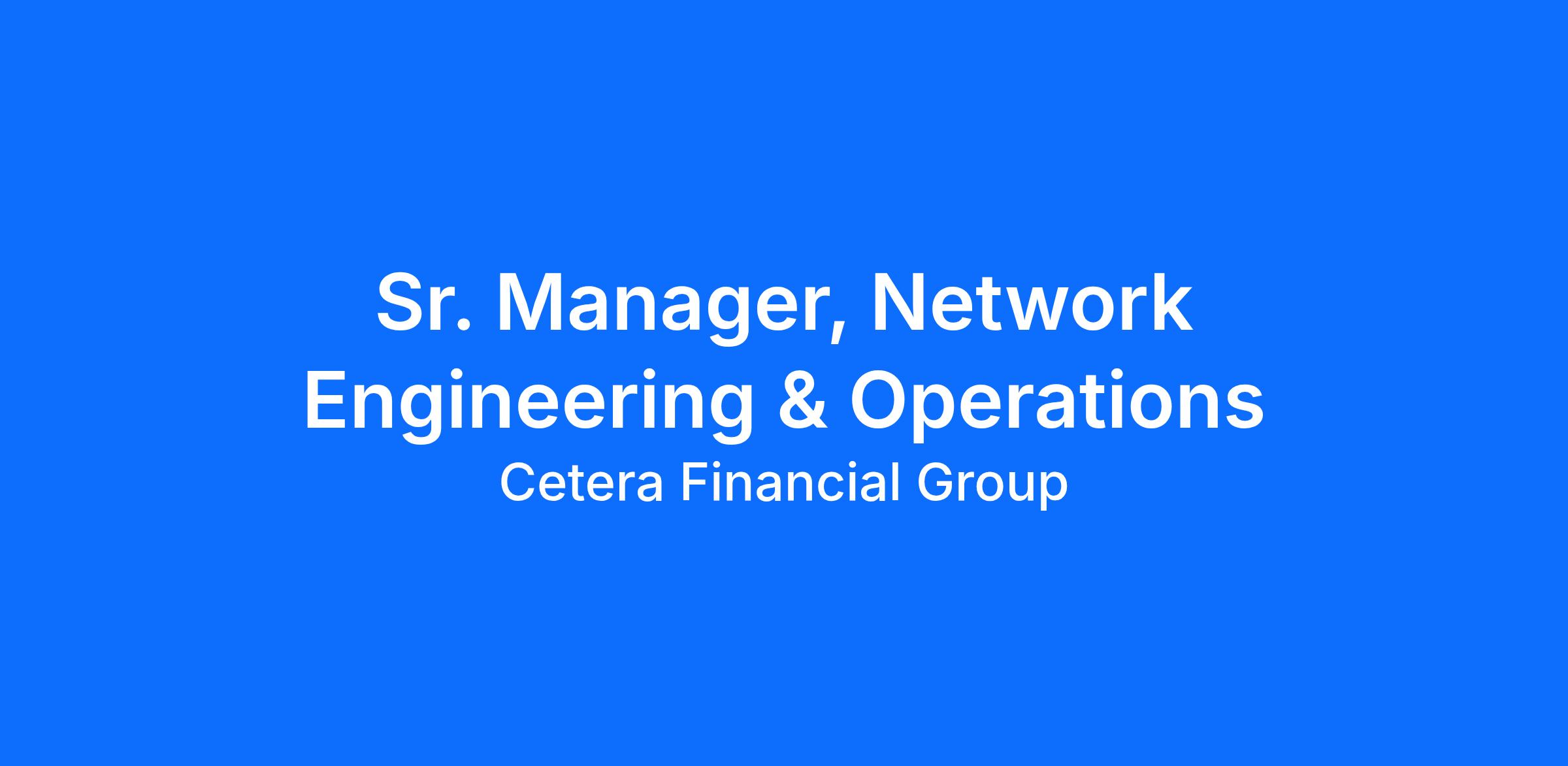 Cetera Financial Group is currently seeking a Sr. Manager Network Engineering & Operations for our company’s office located in either Dallas, San Diego or El Segundo. This is a unique opportunity to be a part of our world class Infrastructure team to run our Enterprise Environment, stay in touch with latest technology and provide world class customer service to internal and external clients.