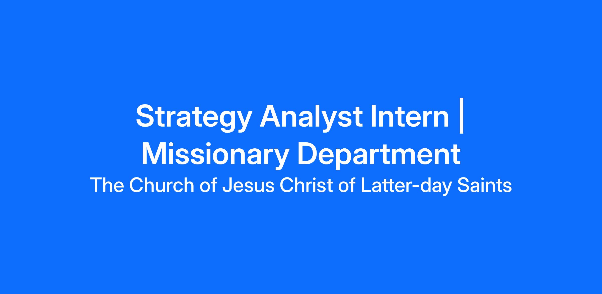 The purpose of this position is to help bring God's children unto Jesus Christ by assisting department leaders to identify opportunities, challenges, and solutions to accelerate the gathering of Israel on both sides of the veil and prepare the world for the Second Coming of the Savior. This strategy analyst is a development entry-level role that supports the Missionary Department strategy manager to conduct research, analyze data, and develop insights to support the strategic goals of the Missionary Department. This is a one-year internship.