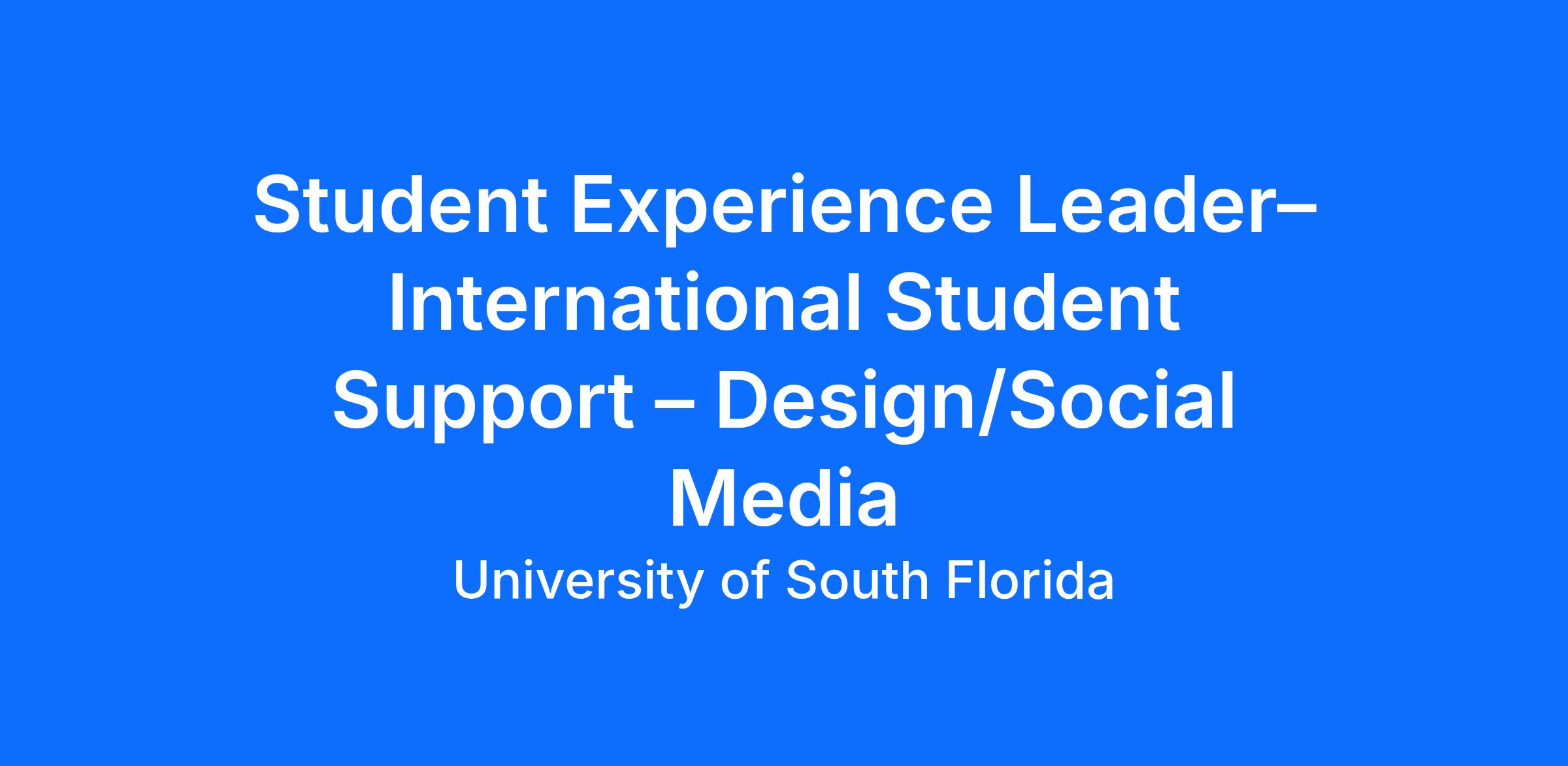 Student Experience Leaders (SELs) represent the University of South Florida to prospective, and enrolled students and their families as well as providing support services to the USF International Student Support (ISS) team. Serving as a Student Experience Leader is an excellent opportunity to represent the University in a professional capacity, to develop excellent communication skills, and to share your enthusiasm for USF with prospective and newly admitted students as well as a mentor and resource to current students as they progress through their academic journey. Candidates will be provided with training to ensure success in the role of SEL.