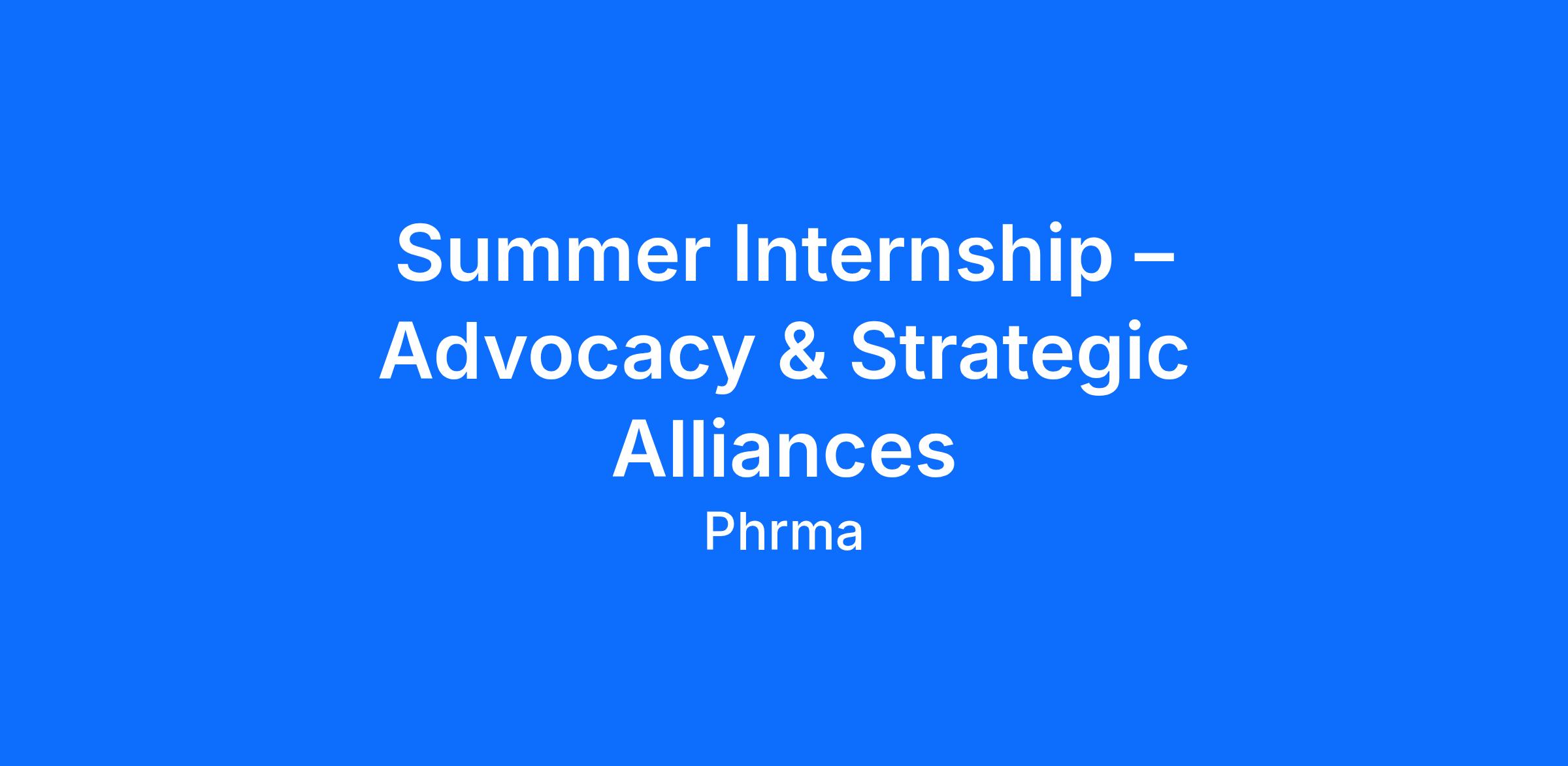 The Pharmaceutical Research and Manufacturers of America (PhRMA) is seeking an internship candidate to support the Advocacy & Strategic Alliances (Alliance) department at our Washington, DC, Headquarters office. The intern will broadly assist members of the Alliance team and work with other departments.