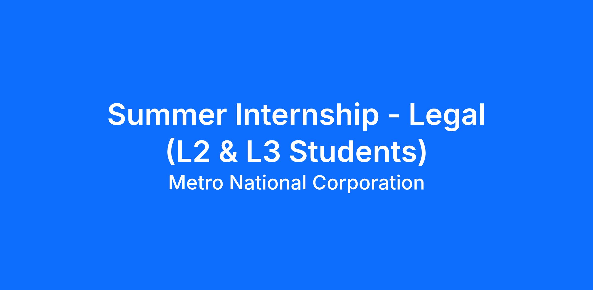 MetroNational’s Legal Internship offers a structured, paid experiential learning opportunity for law students who are currently enrolled in and pursuing a Juris Doctor (J.D.) degree. This internship is designed to expose emerging legal talent to the diverse legal needs of a multifaceted real estate development, asset management, and operations organization.