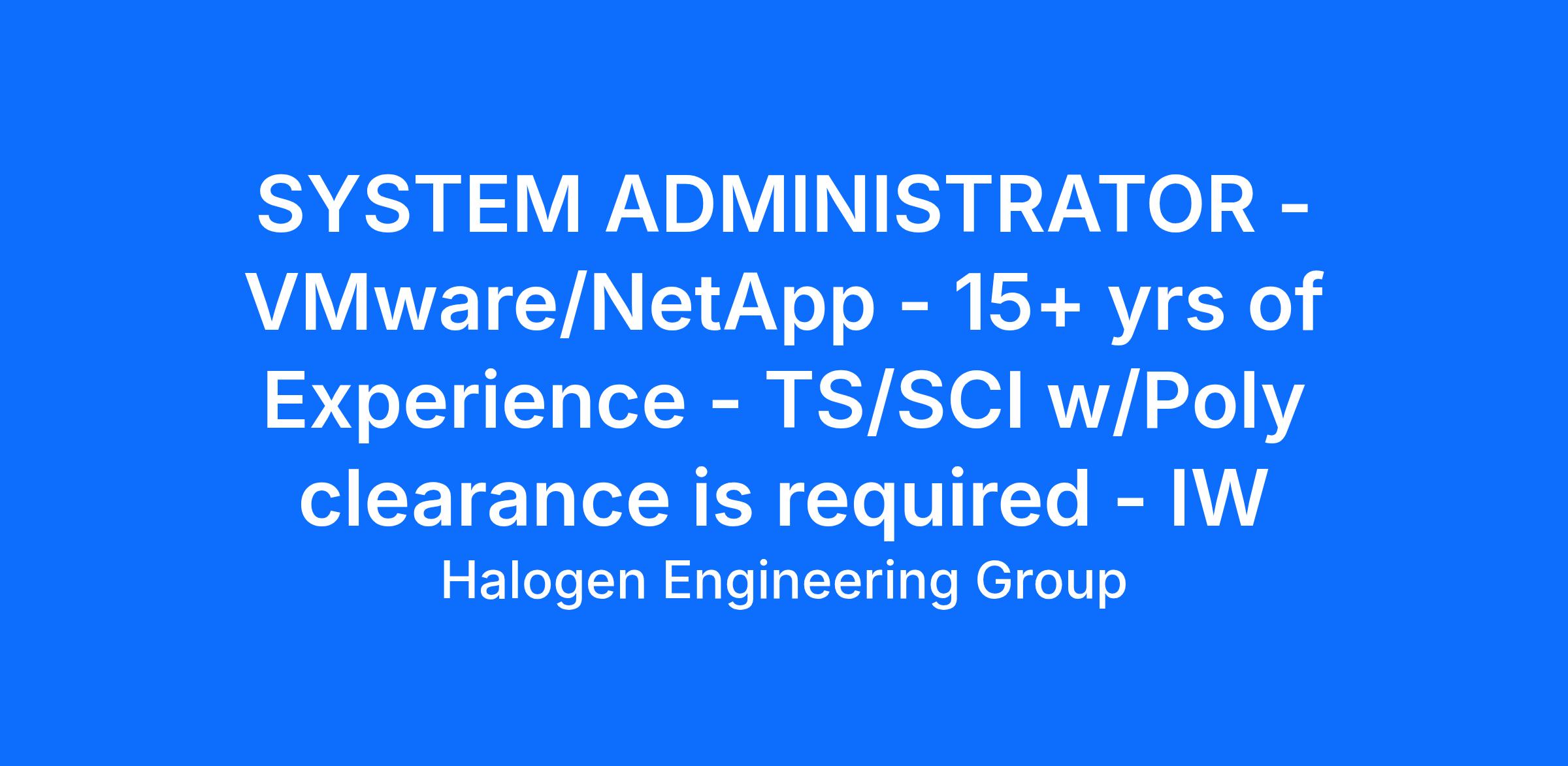 System Administrator - VMware/NetApp - 15+ yrs of Experience - TS/SCI w/Poly Required