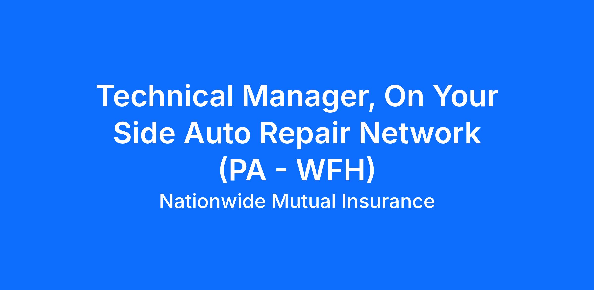 Nationwide pays on a geographic-specific salary structure and placement within the actual starting salary range for this position will be determined by a number of factors including the skills, education, training, credentials and experience of the candidate; the scope, complexity and location of the role as well as the cost of labor in the market; and other conditions of employment. If a Sales job, Sales Incentives, based on performance goals are possible in addition to this range. Note on Compensation for Part-Time Roles: Please be aware that the salary ranges listed below reflect full-time compensation. Actual compensation may be prorated based on the number of hours worked relative to a full-time schedule. The national salary range for Technical Manager, On Your Side Auto Repair Network - Vendor Management : $87,000.00-$162,000.00 The expected starting salary range for Technical Manager, On Your Side Auto Repair Network - Vendor Management : $87,000.00 - $131,000.00