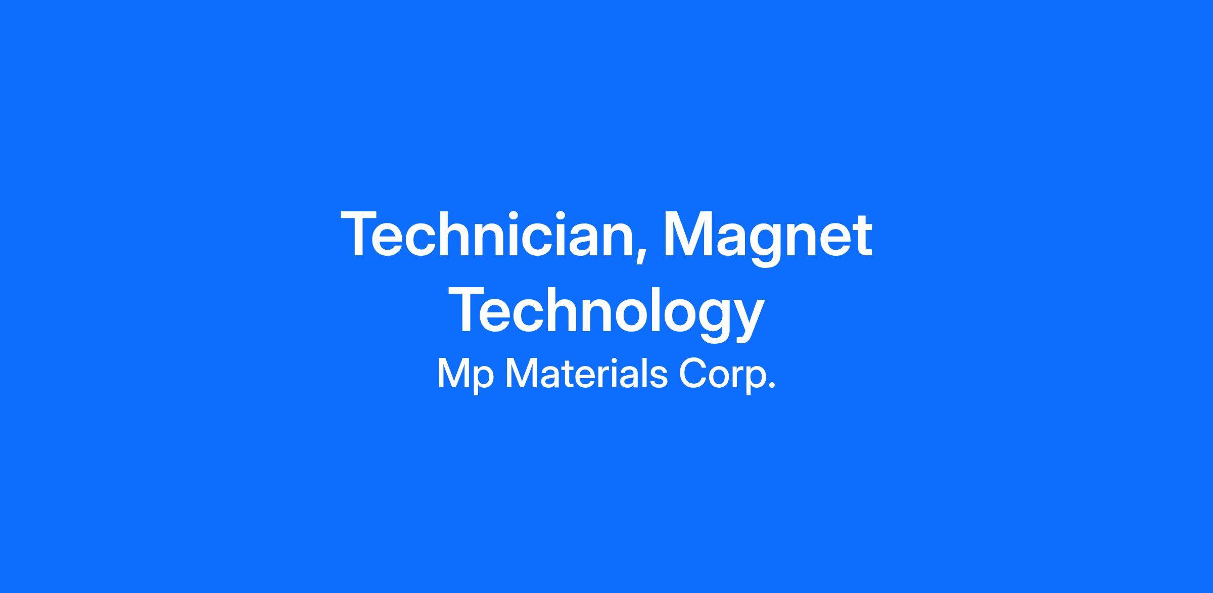MP Materials is seeking a Magnet Technology Technician to work in a one-of-a-kind magnet facility with world-class development equipment. The Magnet Technology Technician will support development of the technology and commercial-scale manufacturing footprint required to make high-performance permanent magnets for cutting-edge applications. The ideal candidate has experience working in a flexible, fast-paced manufacturing or laboratory environment and enjoys doing hands-on work. This position will support key projects across a broad range of initiatives, including development of materials for optimum performance, manufacturing process development and optimization, and more. This is an opportunity to be a part of the development team driving the creation of an advanced manufacturing facility and helping to define the future of American manufacturing.